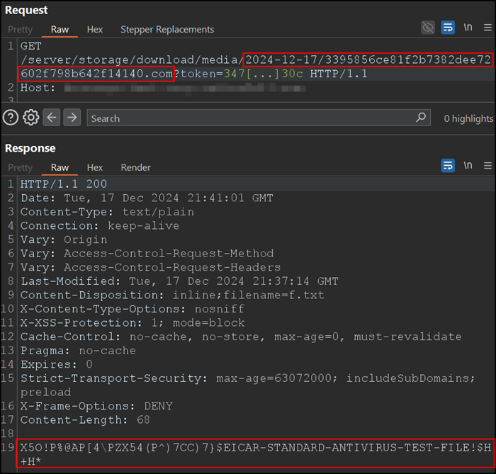 Der folgende Screenshot zeigt einen beispielhaften HTTP-Request an das Backend, der von der Anwendung mit dem Token in der URL gestellt wird:
