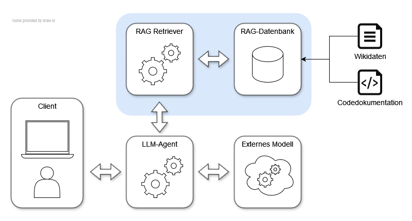 Stellen wir uns ein typisches Beispiel zur Integration von LLMs vor: Ein Unternehmen setzt einen internen Chatbot ein, der Mitarbeitenden als Wissensdatenbank für Wiki-Inhalte und der Codedokumentation dient. Die Architektur setzt sich aus mehreren Schlüsselkomponenten zusammen: einem LLM-Agenten, einem extern angebundenen Modell, sowie einem RAG-System (blau hinterlegt), welches die Wiki-Inhalte und Codedokumentation für Anfragen bereitstellt und in einer Vektor-Datenbank speichert: