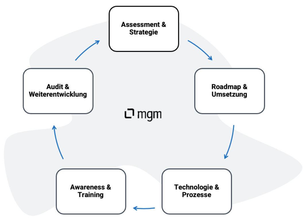 - Audit & Continuous Improvement – Regelmäßige Tests, Sicherheitsüberprüfungen und die Optimierung Ihrer Security-Governance stellen sicher, dass Ihr Unternehmen dauerhaft geschützt bleibt – ohne unnötige Bürokratie. (Effizient & nachhaltig)
