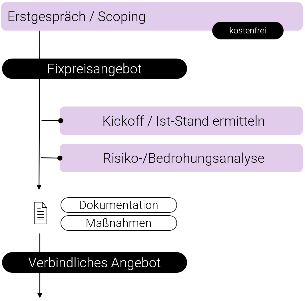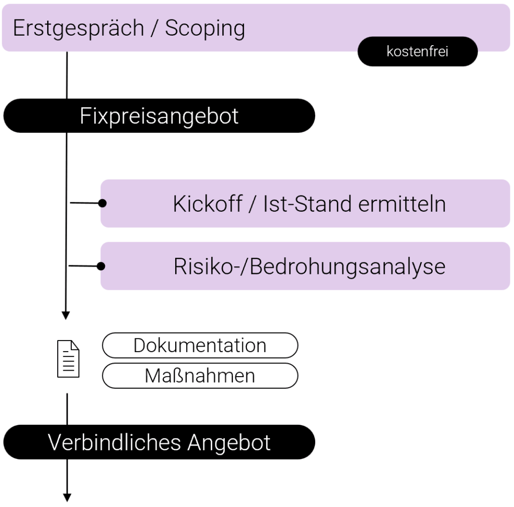 - Ist-Stand Ermittlung / Bedrohungsanalyse: Sie erhalten ein Fixpreisangebot für die Ermittlung der Risiko- und Bedrohungssituation – die Voraussetzung für alles Weitere.